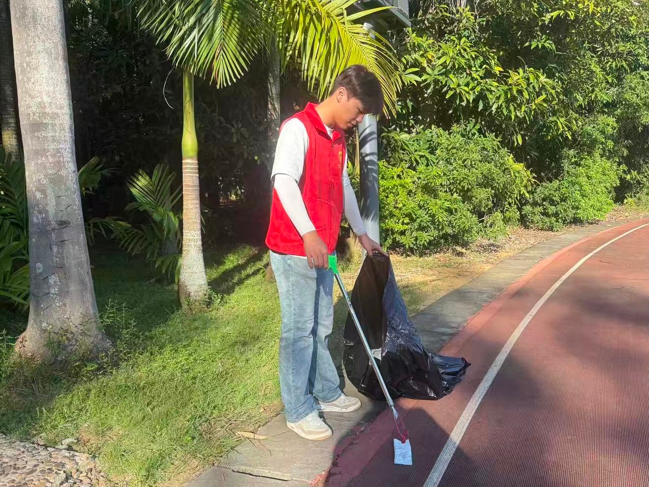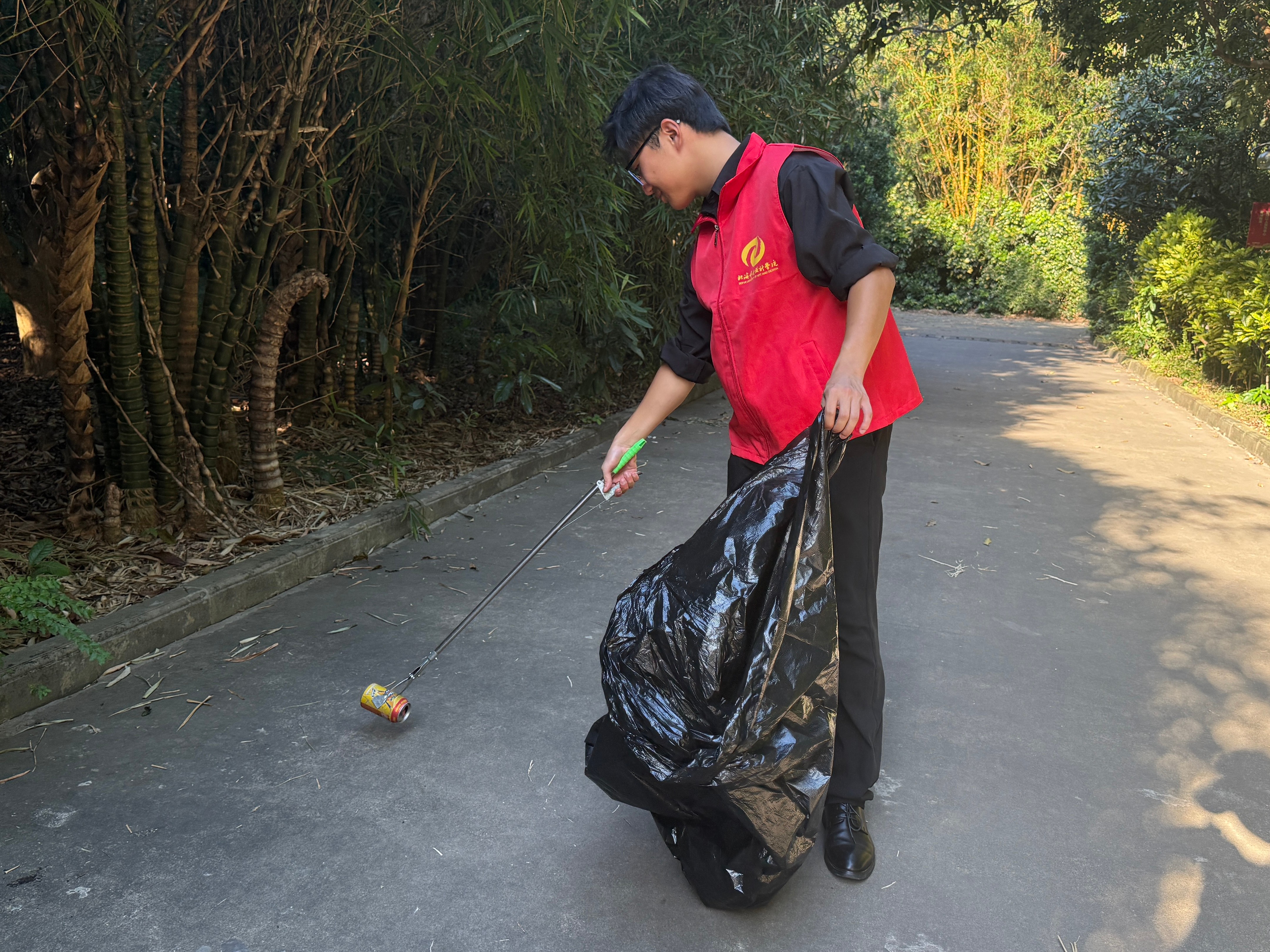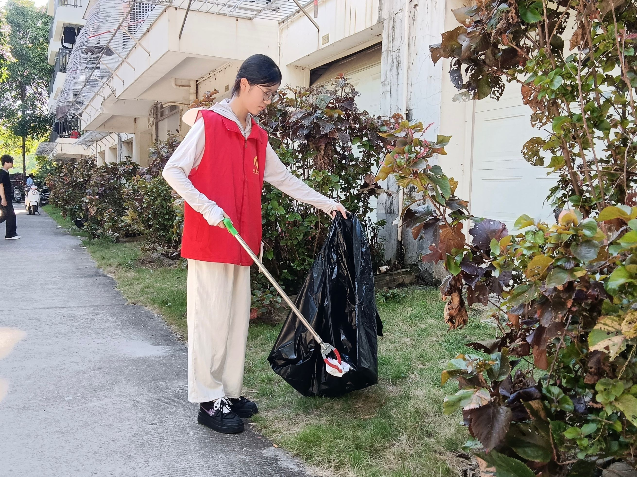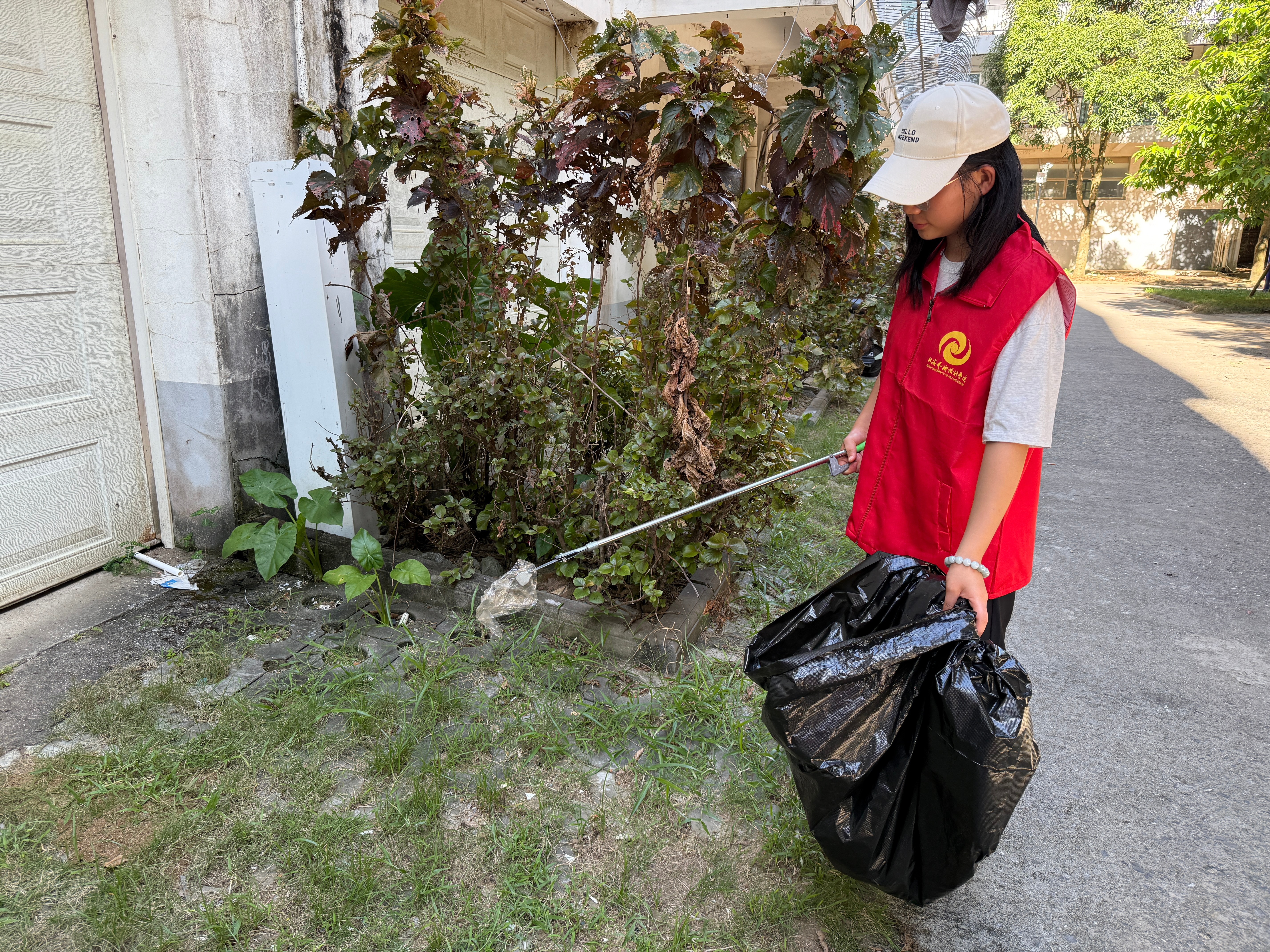 活动伊始,志愿者们按照预先分好的小组分头行动。其中一组的志愿者重点开展垃圾清理工作。大家携带垃圾夹、垃圾袋等工具,对校园道路两侧、绿化带间隙、操场周边等区域进行全面清洁,将散落的纸屑、塑料杂物、枯枝落叶等一一夹起并装入垃圾袋,不放过任何一处卫生死角。另一组志愿者则开展杂草清除作业。志愿者们俯下身来,对树边长势杂乱的杂草进行拔除。此举不仅有效提升了校园绿化景观的整洁度,而且进一步压缩了蚊虫栖息空间,为营造清爽的校园环境奠定基础。