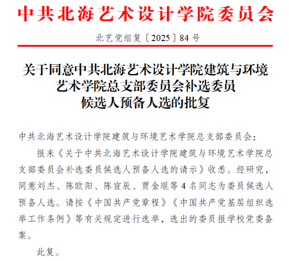 关于同意中共北海艺术设计学院建筑与环境艺术学院总支部委员会补选委员候选人预备人选的批复