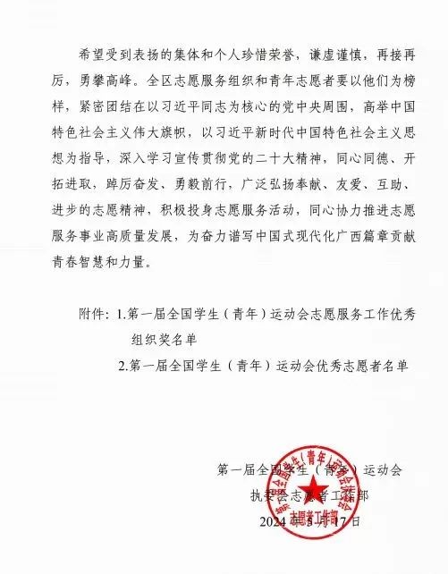 近期,第一届全国学生(青年)运动会执委会志愿者工作部下发《关于通报表扬第一届全国学生(青年)运动会志愿服务工作优秀组织奖和优秀志愿者的通知》,我校荣获学青会志愿服务工作优秀组织奖,并有11位同学荣获优秀志愿者。