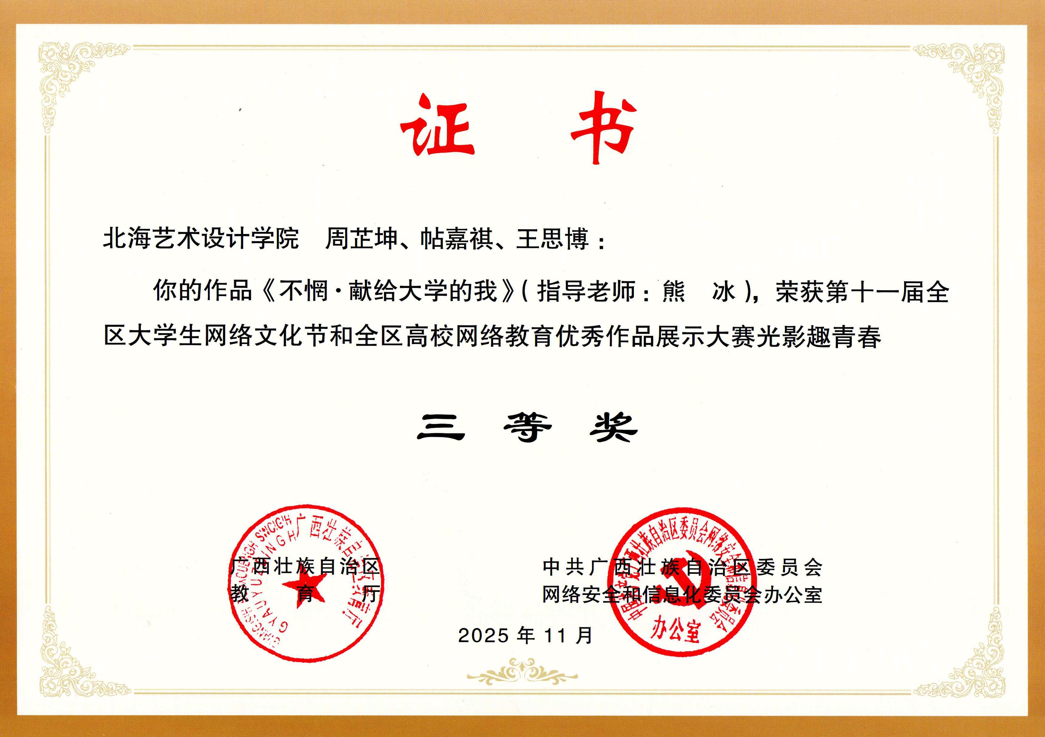 喜报:我院教师熊冰指导学生作品《不惘·献给大学的我》荣获第十一届全区大学生网络文化节和全区高校网络教育优秀作品展示大赛光影趣青春三等奖