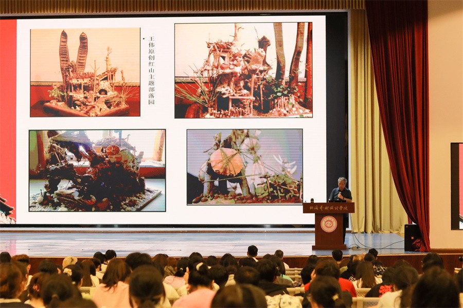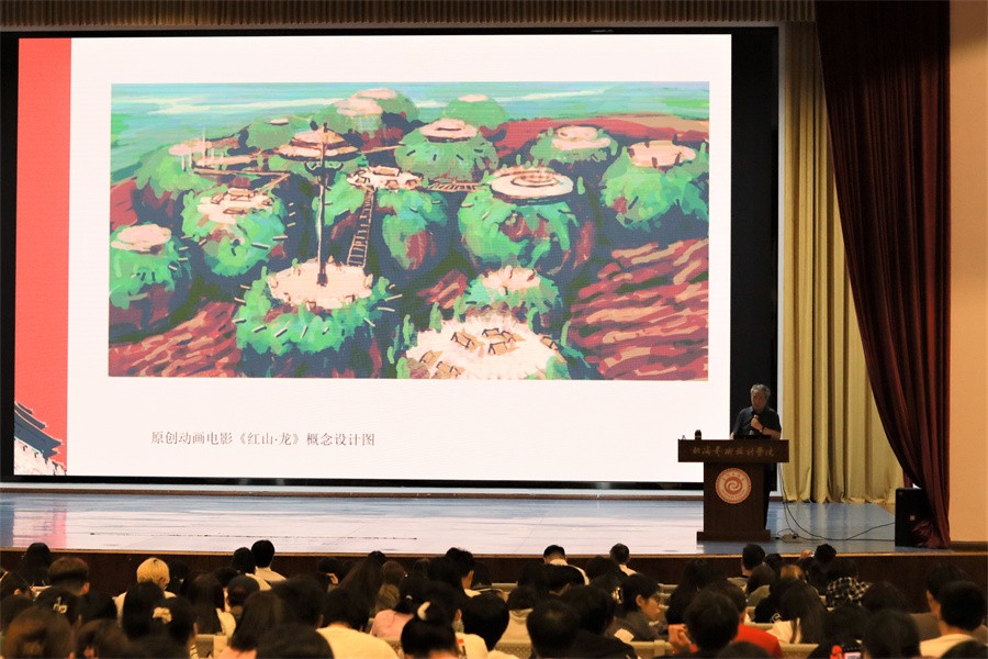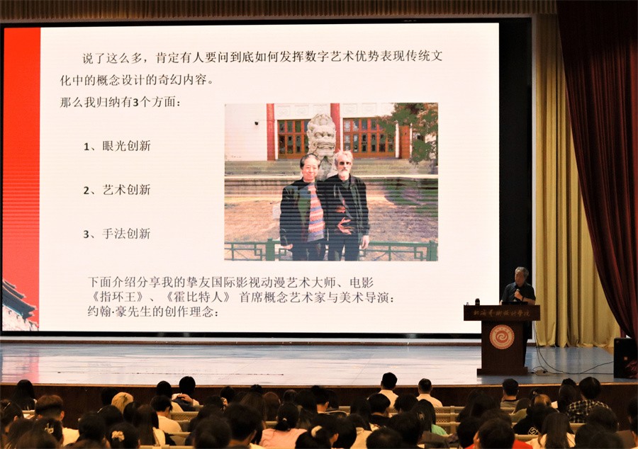 王伟教授播放《红山·龙》的场景概念图、50米电影概念场景设计长卷、角色造型设计图,说明未来的艺术是靠想象力、“数字”是工具,“艺术”是内涵。他鼓励同学们保持想象力,利用技术的手段展现无尽的想象力。