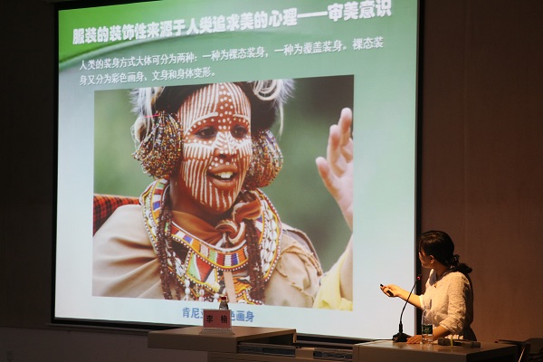 随后,李楠教授从服装的功能、服装的传播规律以及服饰传播与设计等方面进行深入讲解。服装具标识功能,是信息传达的重要媒介。不同的服装向人们传递出不同的信息,可以展示个体的社会地位、职业、个性、性格、心情等。如少数民族自己刺绣的儿童背带,倾注着伟大的母爱;英国的给孩子穿灰色系衣服,展示绅士优雅的形象。服装的起源多种多样,包括原始部落的服饰、首饰、纹身、疤痕以及人体彩绘和身体变形等,它们都蕴含一定的文化象征意义,体现了服饰作为信息媒介的力量与作用。