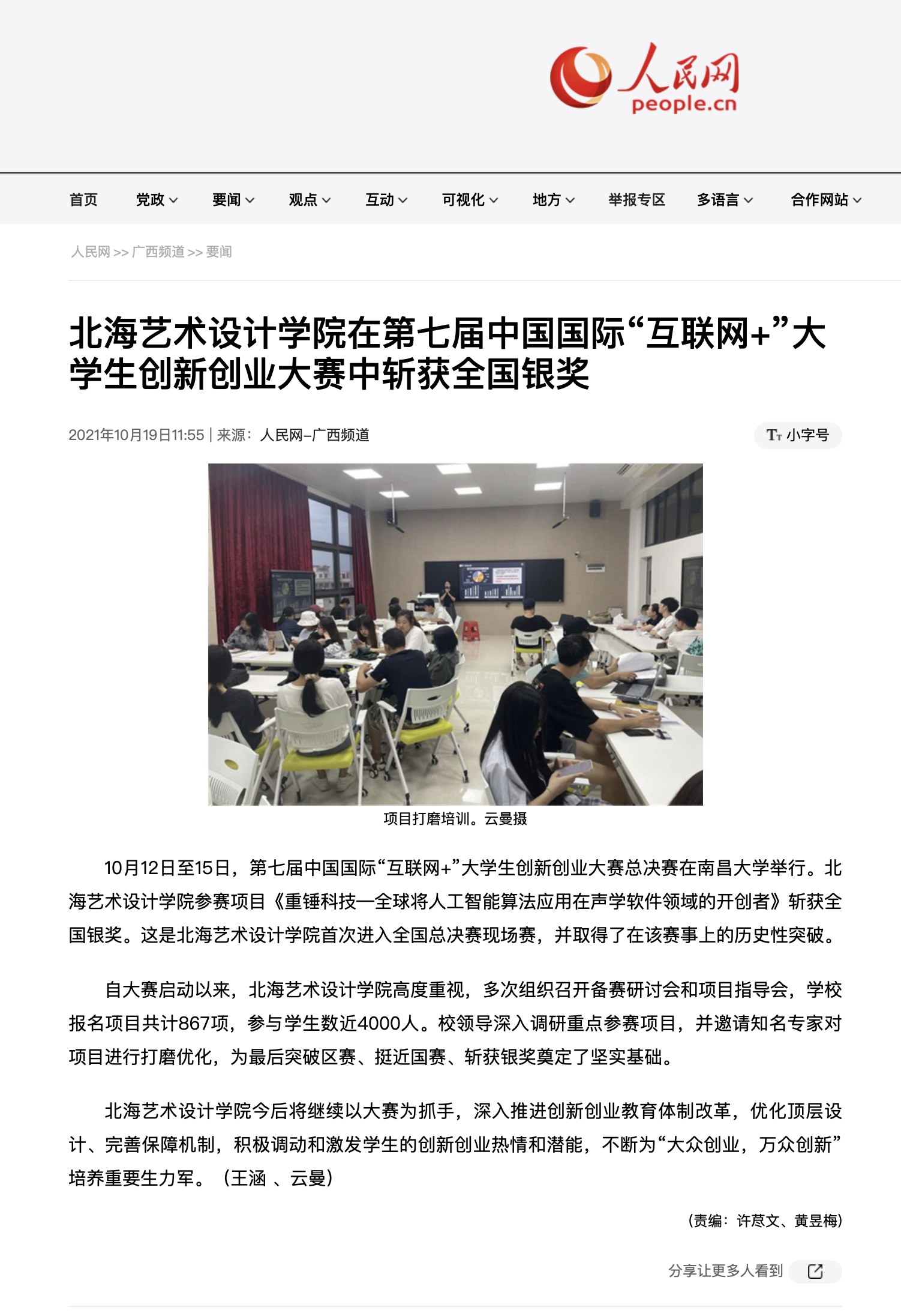 人民网:北海艺术设计学院在中国国际“互联网+”大学生创新创业大赛广西赛区选拔赛中喜获佳绩