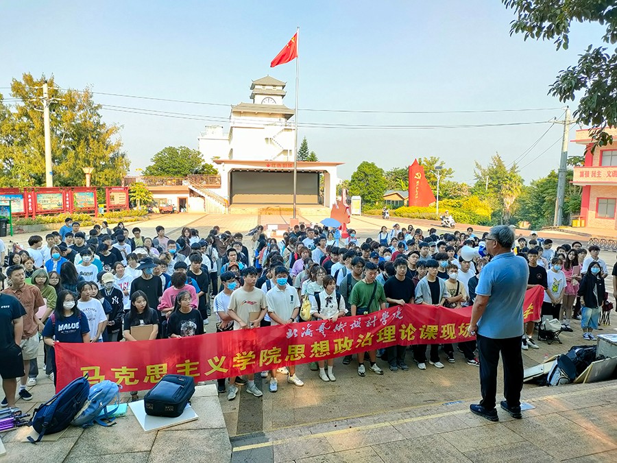 10月21至24日,我校动画与传媒学院2022级动画专业学生到涠洲岛开展综合实践活动,活动第一站在北海涠洲岛红色广场进行思想政治理论课现场实践教学,由马克思主义学院院长姜献生教授进行授课。