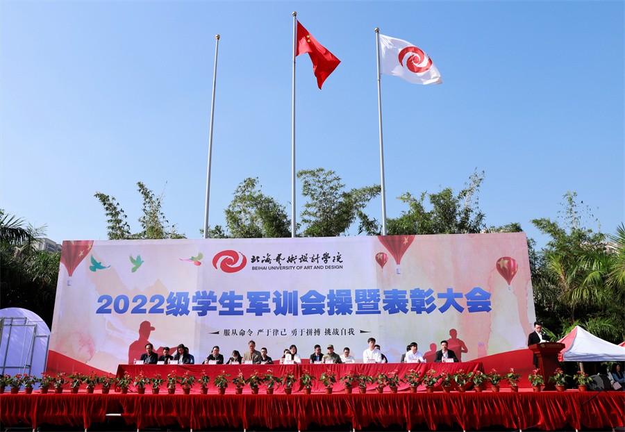 会上,党委副书记、副校长彭仁作军训总结,他首先代表学校向承担本次军训任务的北海市海城区武装部和全体教官们表示衷心感谢,向圆满完成军事训练任务的3700名学生表示热烈祝贺。他表示,此次2022级学生军训共成立了4个营、61个连队,完成了各项特色科目的军事训练,开展了主题教育活动、合唱比赛等,同学们以饱满的精神和满腔的热血,出色彰显北艺学子勇猛果敢的力量,充分展示独一无二的“2022风采”。他强调,今年是中国共产主义青年团成立100周年,也是中国共产党第二十次全国代表大会召开之年,世界百年未有之大变局加速演进,中华民族伟大复兴进入关键时期,国家兴亡匹夫有责。作为新时代中国特色社会主义事业的接班人和祖国国防建设的后备军,为新时代添砖加瓦,是时代赋予广大青年学子的社会责任。他希望同学们在完成军训后继续巩固和深化训练成果,在今后的学习生活中,努力做到:一是坚定和践行军训中涵养的爱国之志,紧扣时代脉搏、培养创新能力,练就过硬本领,锤炼成德才兼备、报效祖国的栋梁之才;二是珍视和发扬军训中养成的优良作风,将优良军风转变为优良学风,养好习惯,热爱专业,钻研知识,全面提高个人素质;三是传承和发扬军训中养成的奋斗精神,把军训中的拼劲、韧劲和勇于战斗、敢于胜利的精神成果转化为学习动力,努力做新时代新征程上的奋进者、开拓者和奉献者。