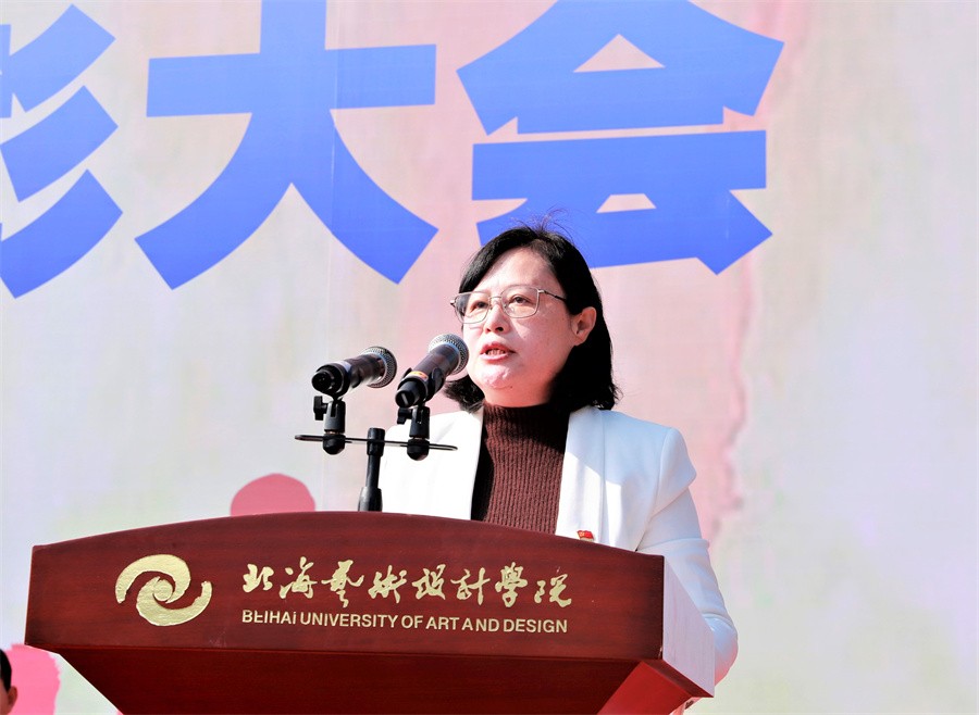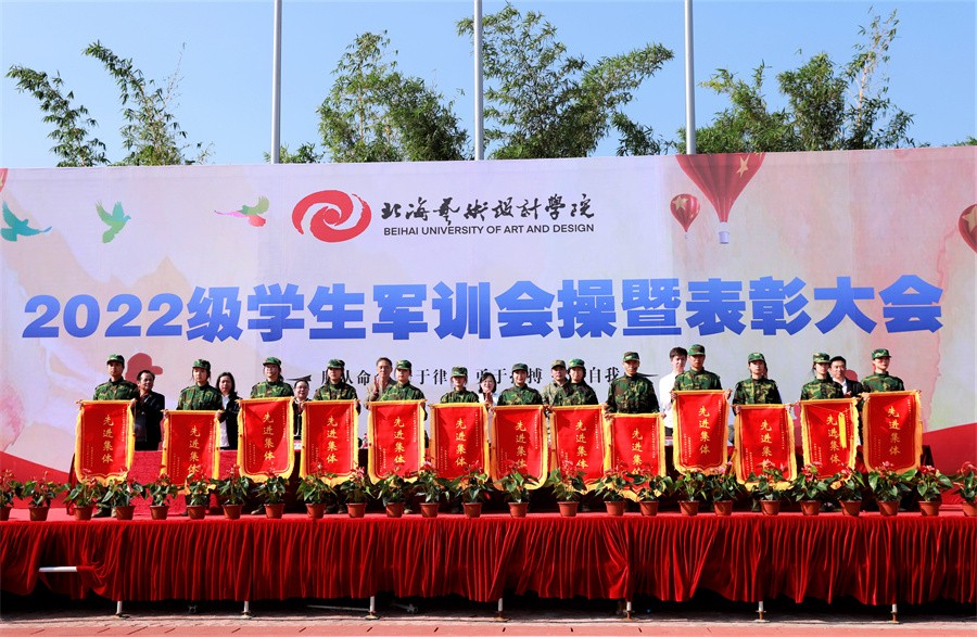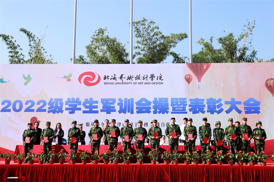 大会上,党委书记张阳宣读了《北海艺术设计学院关于表彰2022级学生军训“优秀标兵”“优秀教官”“优秀内务寝室”和“优秀连队”的决定》,向军训中的优秀个人和先进集体进行表彰,并由现场领导依次颁发荣誉证书和锦旗。(周小琪、大学生记者团影像部/摄)