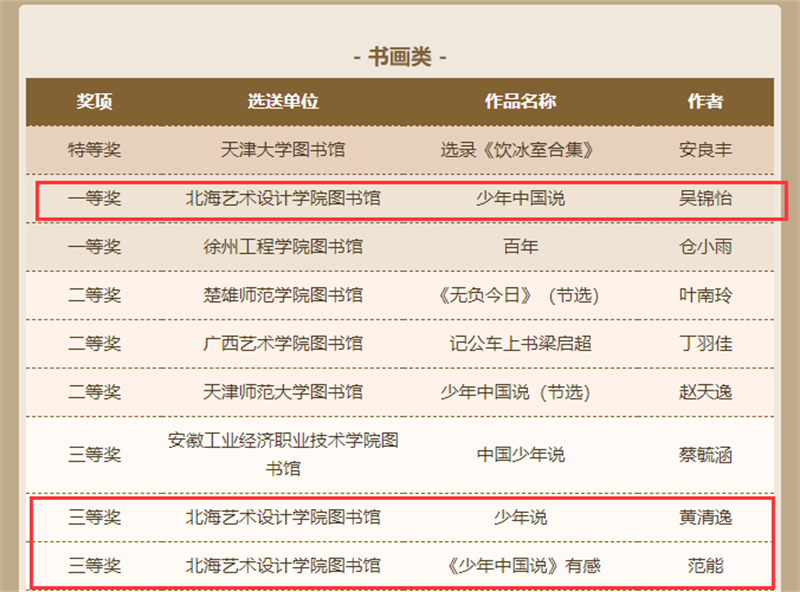 近日,由天津市全民阅读活动办公室、天津高等学校图书情报工作委员会、江苏省高等学校图书情报工作委员会主办的“品读梁启超 阅读创作大赛”的活动线上发布了获奖名单。我校学生作品征文类获得二等奖1名、优秀奖2名;书画类获得一等奖1名、三等奖2名、优秀奖6名;视频类获得一等奖1项、二等奖1项、三等奖4项、优秀奖5项。我校图书馆被评为“经典推广先进单位”“优秀组织单位奖”,学校教师喻广林、熊东等获优秀指导老师奖。