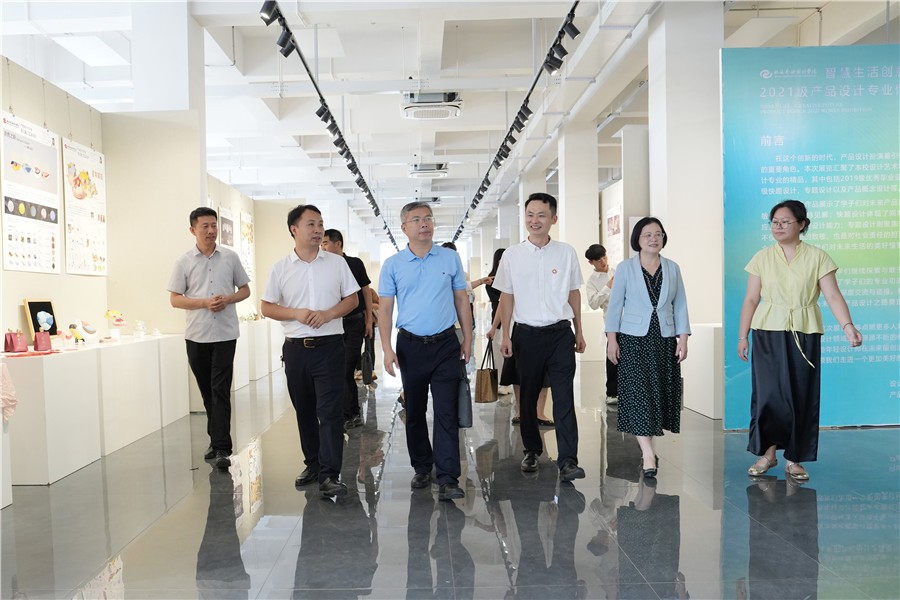 会前,调研组一行参观了我校“校政企行协同育人 服务地方经济发展”展厅,观看了我校美术学院绘画和雕塑展览、设计艺术学院师生作品展等。(周小琪 / 摄)