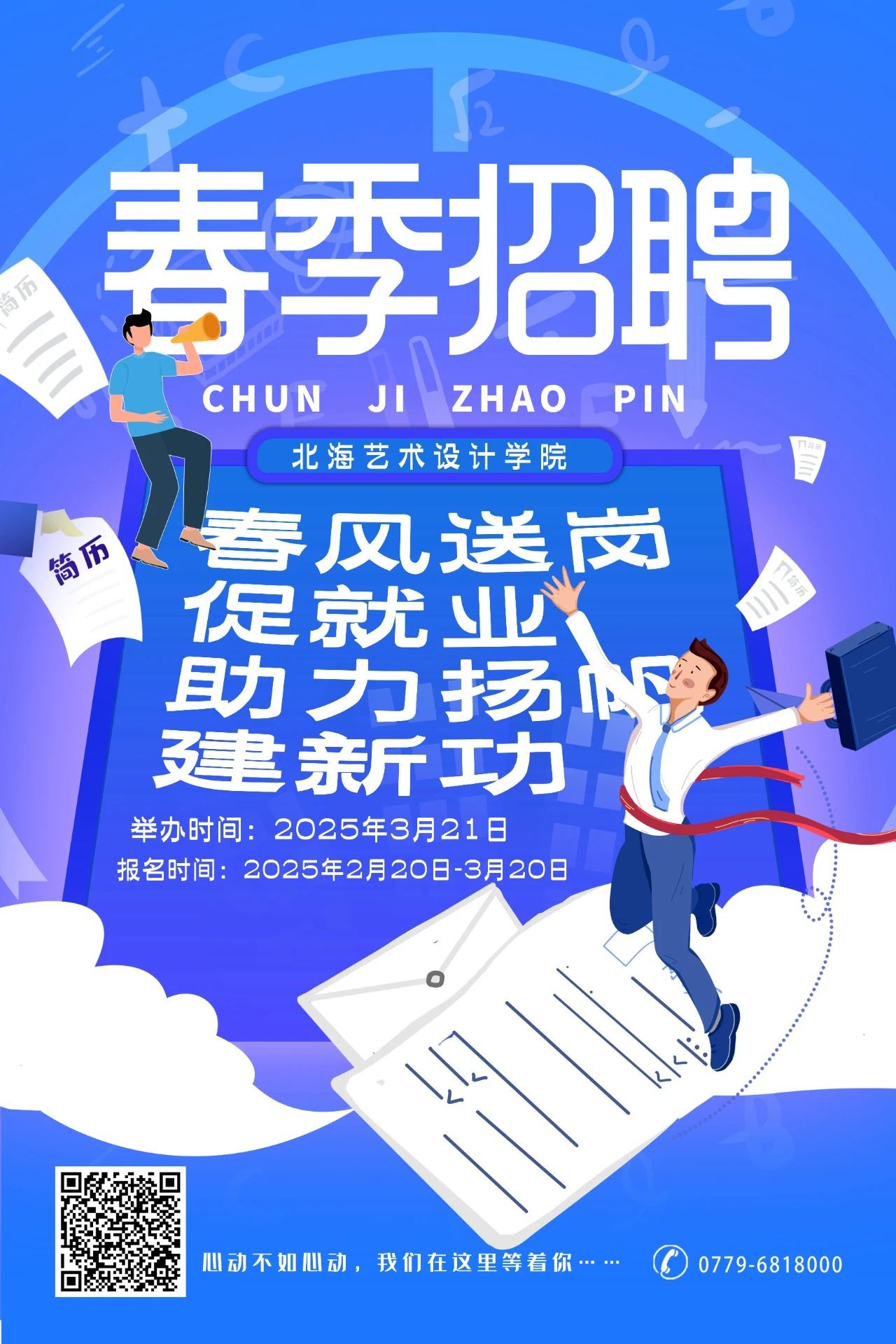 为促进我校毕业生顺利就业、尽早就业,现定于2025年3月21日于北京实践基地(北京邮电大学宏福校区)举办“北海艺术设计学院2025届毕业生春季双选会”(以下简称“双选会”)。诚邀各用人单位报名参加。本次双选会为公益活动,不对任何参会单位及学生收取费用,诚邀各用人单位参会选聘人才!