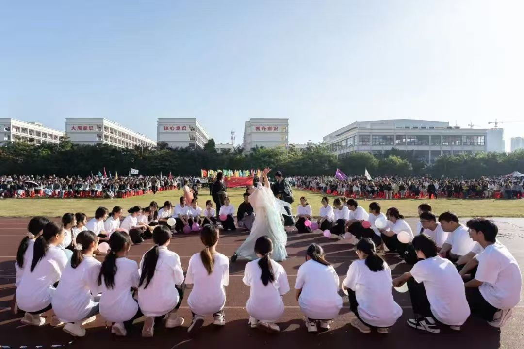 运动会的开幕式上,我院方阵队列无疑是一道亮丽的风景线。全体成员身着统一的白色T恤,T恤上印着彰显哲学专业特色的logo,显得格外醒目。他们手持五彩气球,步伐整齐有力,脸上洋溢着自信的笑容。表演开始后,随着庄严肃穆的音乐声响起,学生代表通过生动的肢体语言重现了庄子与惠子在濠上辩论的经典场景,将这场跨越千年的哲学辩论演绎得淋漓尽致方阵全体还慷慨齐诵了梁启超的《少年中国说》,赢得了现场观众的阵阵掌声。
