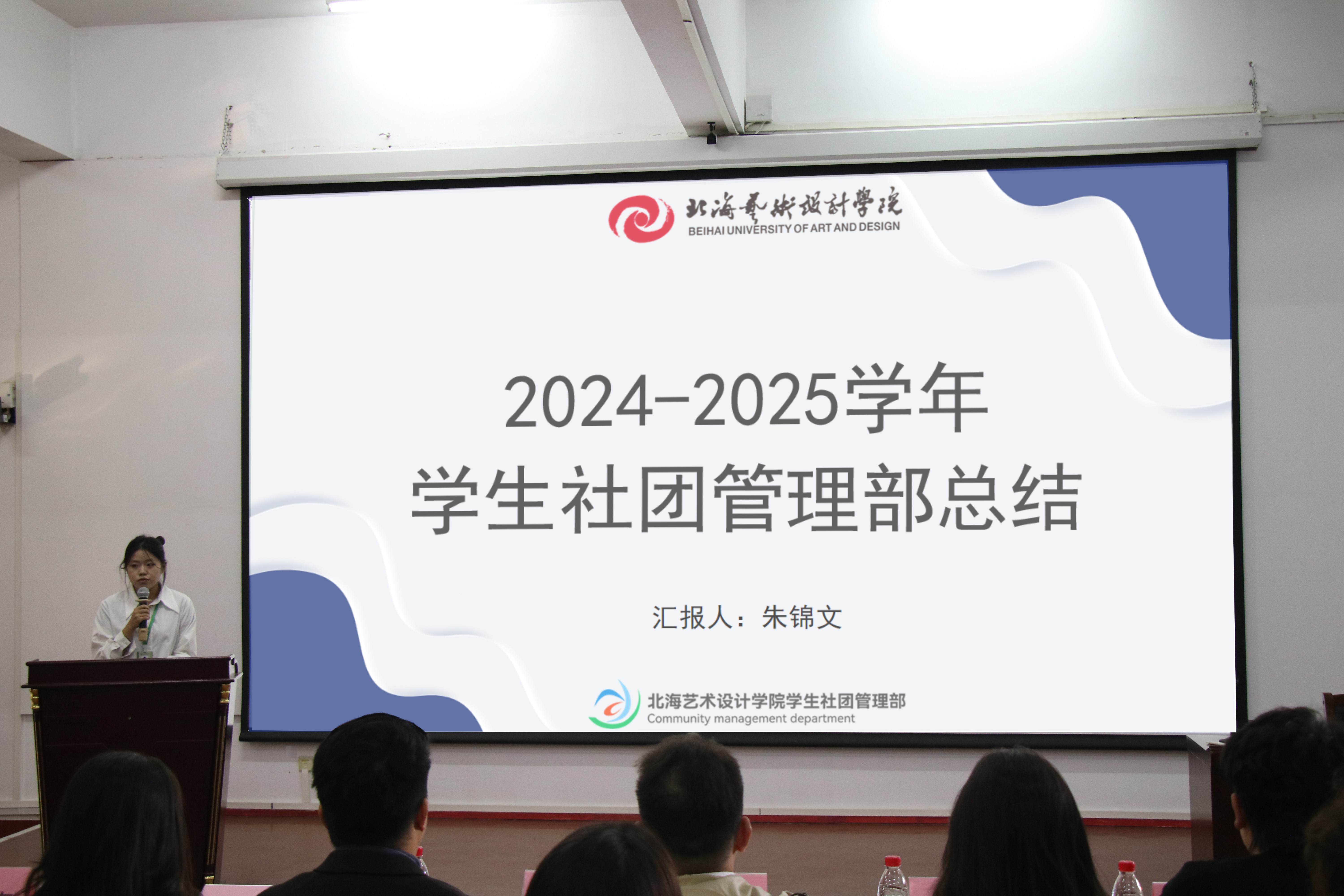 学生社团管理部负责人朱锦文从社团活动、招新工作、培训与考核、存在的问题及未来规划四个方面进行了汇报。社管部在本学期组织了桂花音乐节、素质拓展、海边对话等多项活动,吸引了大量学生参与,但也在部门协作和活动策划方面存在不足。朱锦文展望了下学期的工作计划,包括开展社团文化节、丰富活动内容等。