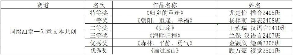 每一份参赛作品,都是学子们艺术素养与AI技术应用能力的集中体现;每一票的认可,都承载着对创新精神的推崇与鼓励。大赛秉承公平、公正的原则,现将最终评选出的各类奖项名单公示如下。