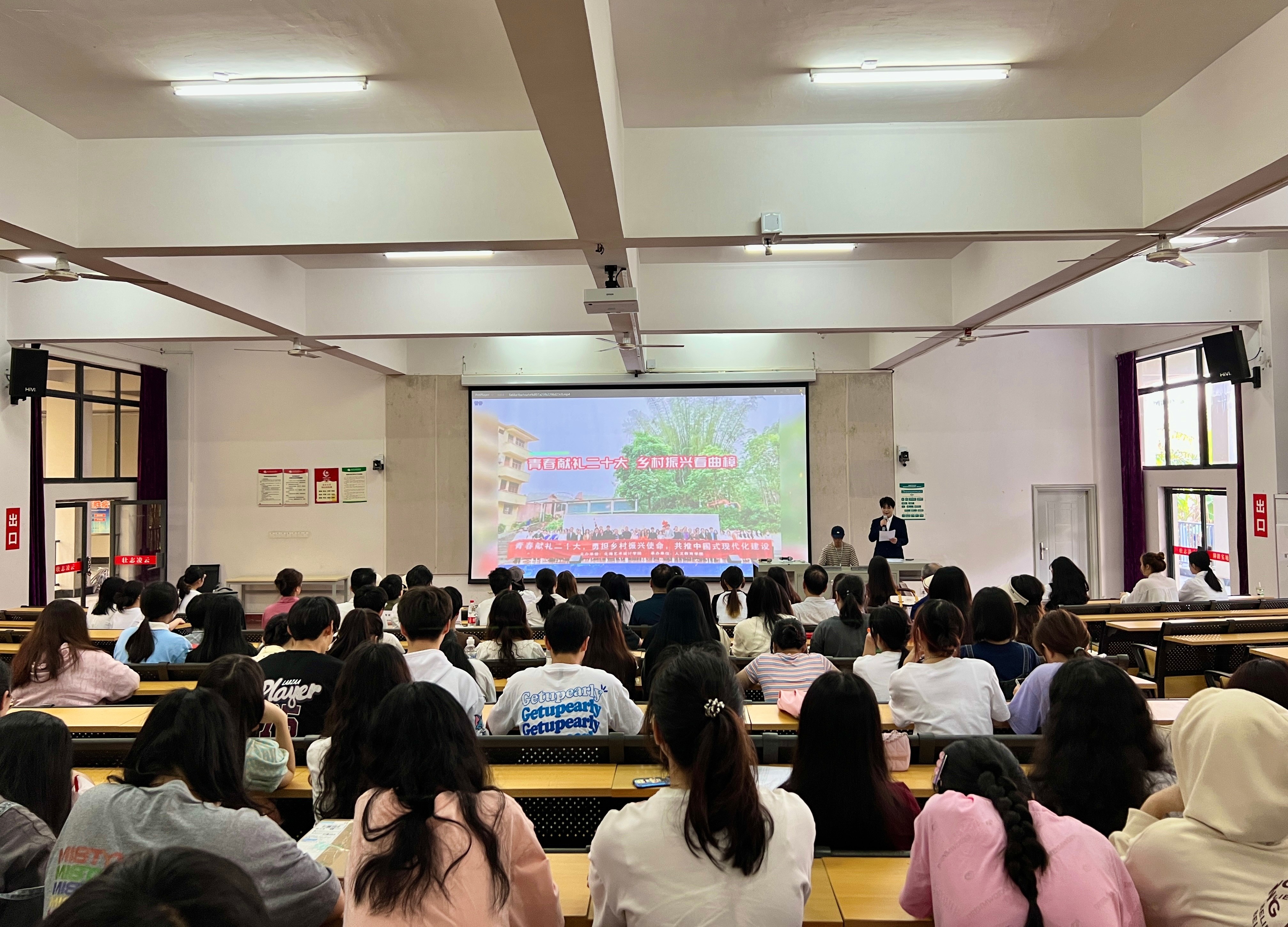 为全方位、多角度、深层次展示北海市合浦县曲樟乡全面推进乡村振兴新举措,深入推进美丽乡村建设新成果,助力曲樟乡自然文化推广,落实我校产教融合系列活动,提高我院学生学以致用思想站位,增强我院学生专业实践能力,我院于四月初举办“青春献礼二十大,砥砺报国实践行”北艺青年助力乡村振兴宣传作品征集活动4月15日下午,我于伦理楼107举行“青春践行二十大,砥砺报国实践行”助力曲樟振兴宣传作品征集大赛颁奖典礼。我校副校长王斌、学校党委委员刘承初、人文教育学院名誉院长蒙绍荣人文教育学院院长熊秀峰、副院长李水亮、副院长梁镨文、合浦县曲樟乡政府委员黄锐以及22级、21级汉语言文学、哲学专业全体学生全体获奖学生参加本次颁奖典礼。颁奖典礼由王梓旭同学主持。