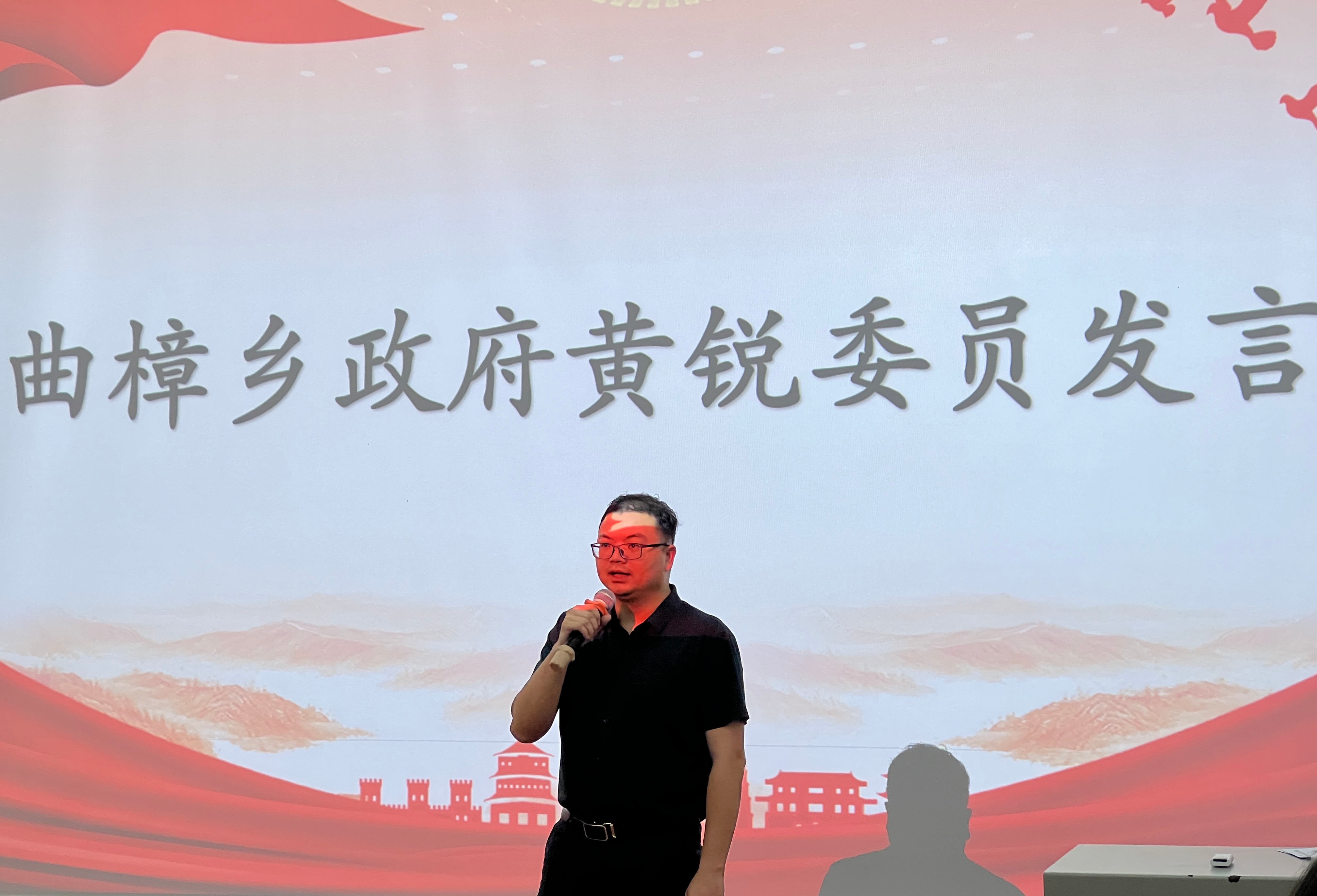接着,曲樟乡政府党委委员黄锐进行发言,首先,他代表曲樟乡人民政府向北艺师生表示诚挚谢,他指出曲樟乡由于地理环境原因难以发展工业,经济落后,在北艺师生的宣传带领下,更多的人熟知曲樟。他希望北艺学生能多去曲樟走走深入挖掘曲樟的美,用文化立乡,让更多的人知晓客家文化的由来和历史。