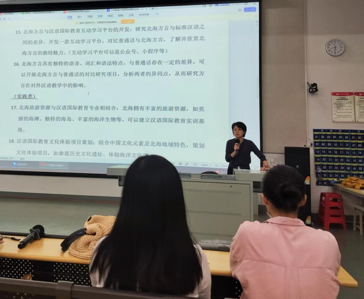 紧接着,各教研室副主任基于各专业特色做针对性指导。汉语言文学教研室副主任姜玮老师为同学们分享了自己指导大创项目的经验,介绍了大创项目的实用价值,并对汉语言文学专业方向的大创选题进行解析,姜老师希望大家在课堂学习之外,更多地去学习技能知识,增长自己的实践创新能力。哲学教研室副主任覃传茵老师根据哲学专业大创项目的案例,强调科研能力和实践能力对今后升学、就业的重要帮助,并结合哲学方向的选题介绍,引导同学们将理论应用到实际生活中。汉语国际教育教研室副主任李雪老师结合汉语国际教育专业特色,鼓励同学们结合北海地方语言和文化做文化传承和推广类的研究,以提高中华文化的国际影响力。提问环节中,在场老师对学生进行了耐心指导,鼓励同学们要大胆主动,有问题可以积极寻求老师的帮助。