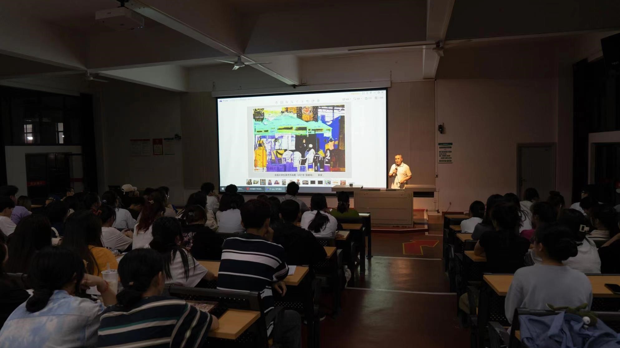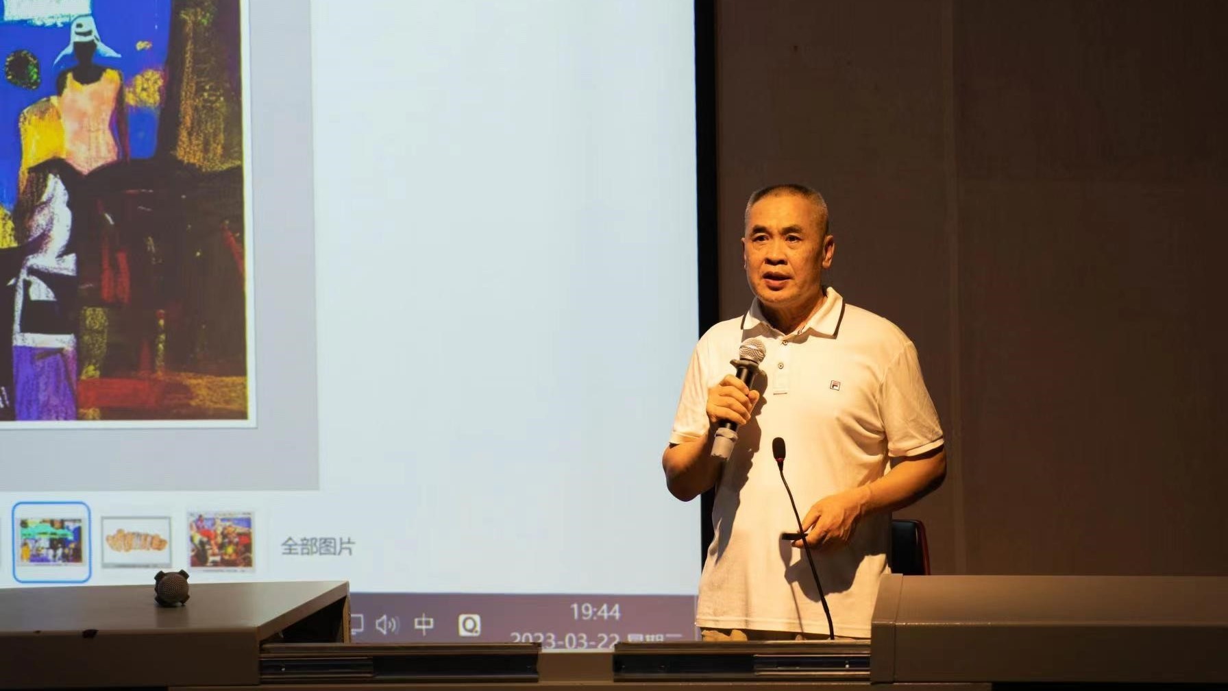 2023年3月22日,于我校西校区伦理楼107教室,刘广滨教授为我校美术学院绘画20-22级水彩方向的学生带来了一场题为《水彩画的个性语言》的精彩讲座,讲座由美术学院教师段凝老师主持。