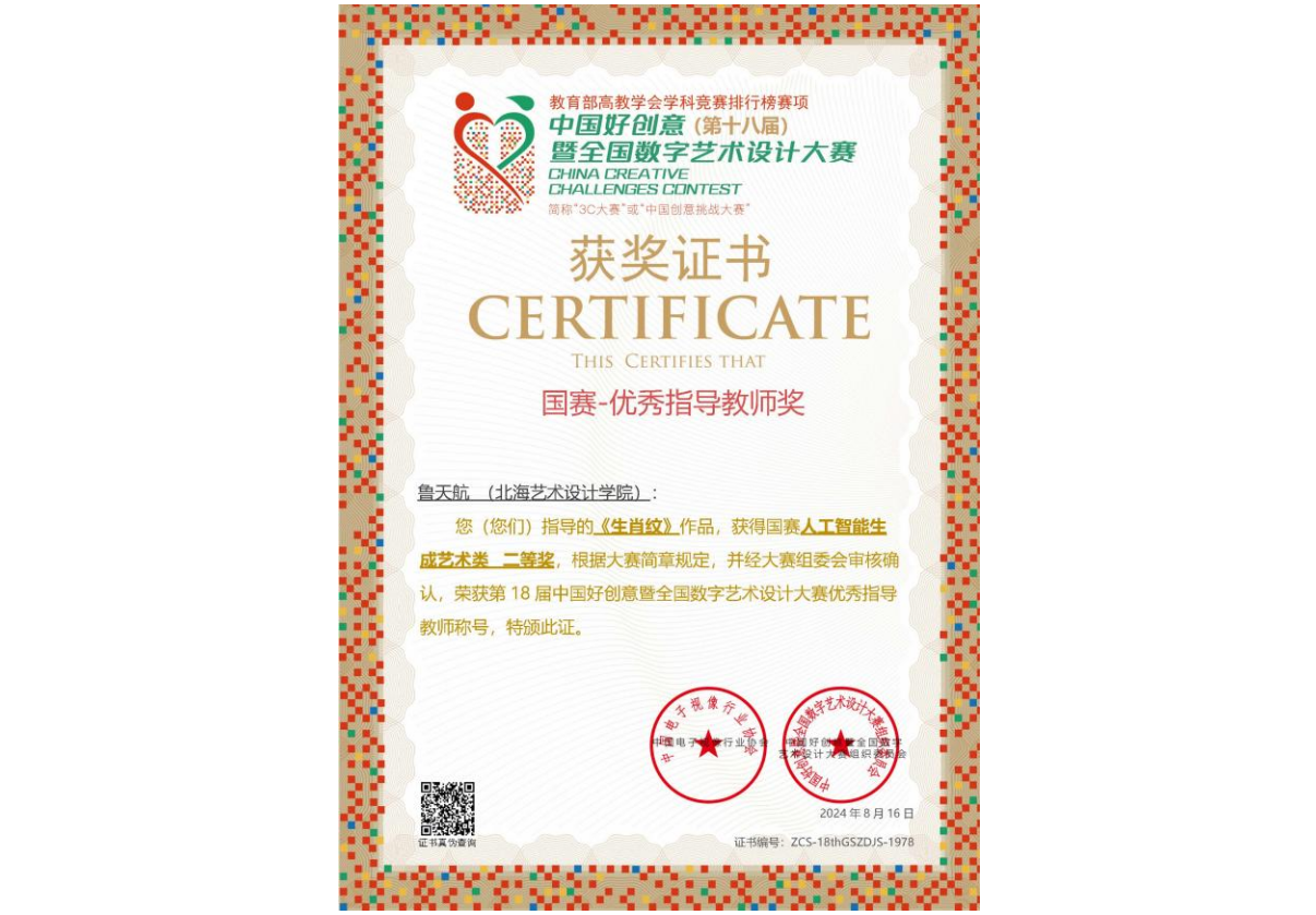 在第18届好创意暨全国数字艺术设计大赛中,动画与传媒学院作品《爱国歌》斩获国赛一等奖,作品《中式赛博朋克——在逃柯基》《生肖纹》《痕迹》《手艺在赣》荣获国赛二等奖,《药叮咚》《呐喊》《璀璨即墨》等11件作品荣获广西壮族自治区省赛奖项。学院张丽君、陈蔓延、谭湘虎、许一桐、鲁天航、王弘武、徐向坤7名老师获评为优秀指导教师。