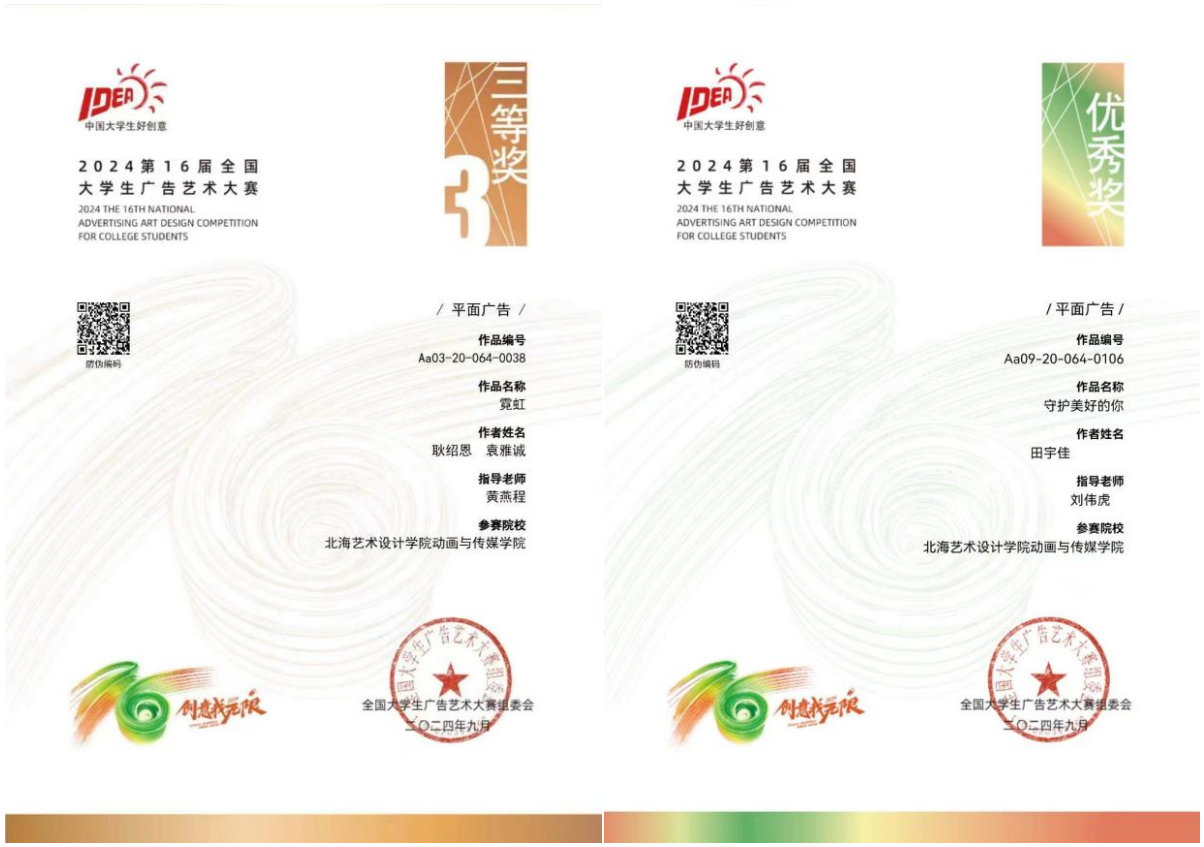 在第16届全国大学生广告艺术大赛中,动画与传媒学院作品《霓虹》荣获国赛三等奖、作品《守护美好的你》荣获国赛优秀奖,《一生与娃哈哈的温暖邂逅》《童年一刻》等10件作品荣获广西壮族自治区省赛奖项。