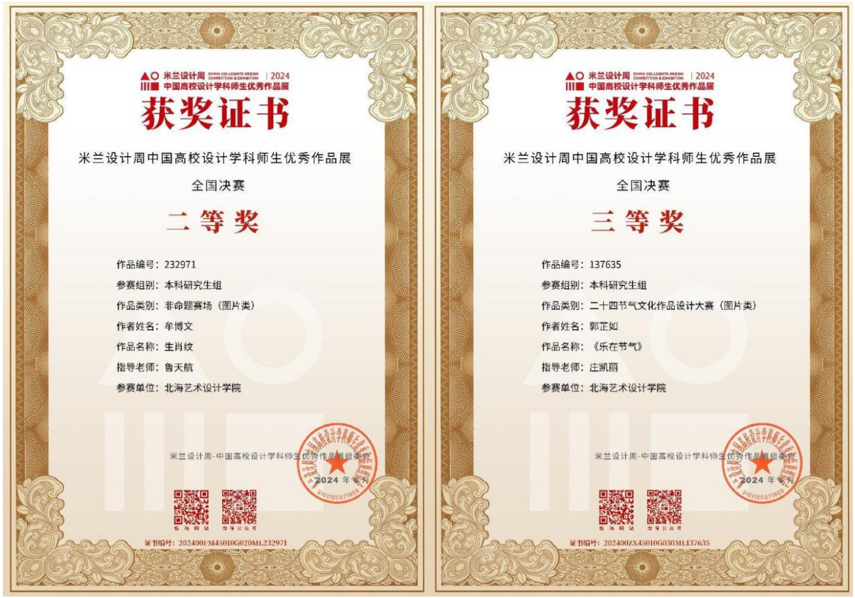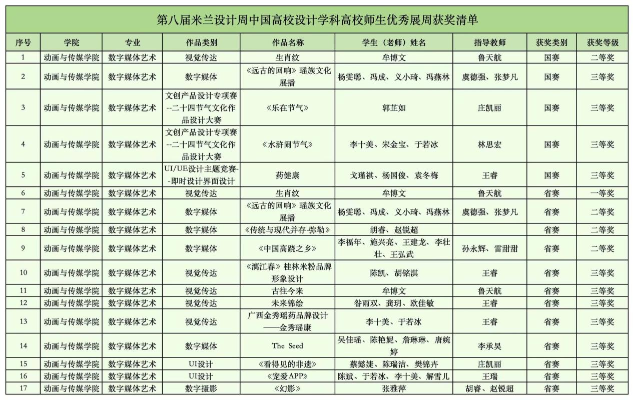 在第八届米兰设计周中国高校设计学科师生优秀作品展中,动画与传媒学院作品《生肖纹》《水墨中的武术》荣获国赛二等奖,作品《远古的回响》《乐在节气》《水浒闹节气》《药健康》荣获国赛三等奖。《传统与现代并存-弥勒》《中国高跷之乡》等12件作品荣获广西壮族自治区省赛奖项。