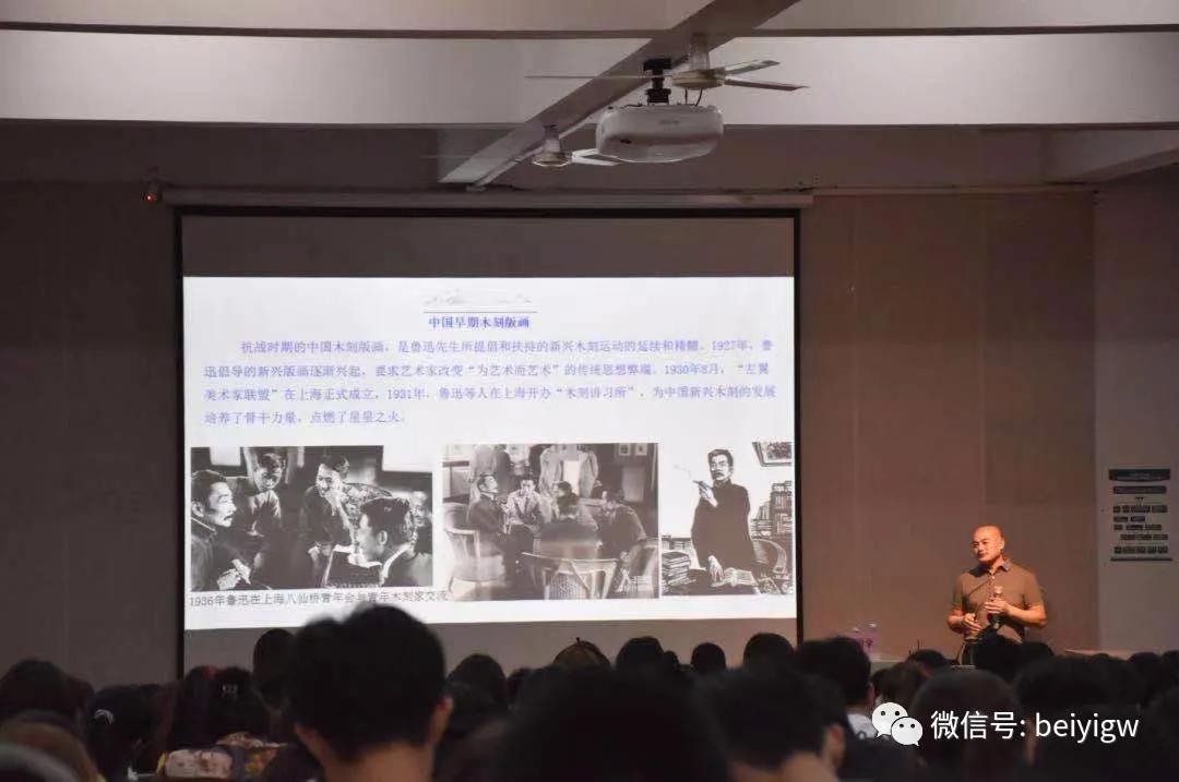 讲座过程中,张教授从中国早期油画、漫画、木刻版画三方面介绍了抗战前的中国美术发展情况。重点回顾了我国早期漫画的发展历程。当时由于日本向俄国学习,取得了政治上的成功,大量青年画家由学洋转为学日,而之后随着学习西方的风潮兴起,中国早期漫画应运而生。