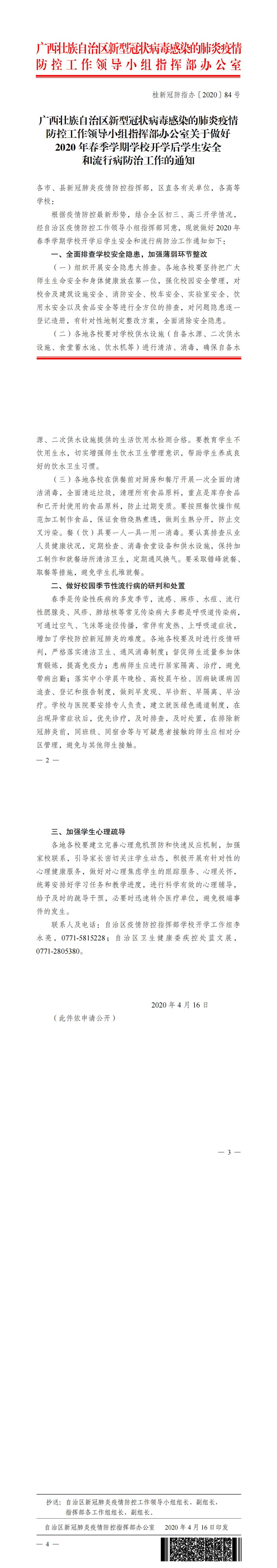 (桂新冠防指办〔2020〕84号)关于做好2020 年春季学期学校开学后学生安全和流行病防治工作的通知