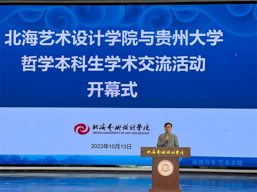 开幕式上,我校总督学王斌代表北海艺术设计学院对出席活动的领导、老师和同学表示热烈欢迎。王斌总督学介绍了我校的发展历史和办学特色。他指出,我校于2019年开办哲学、汉语言文学等新专业,并在此基础上成立了人文教育学院。在师资建设方面,我校形成名师引领、产教融合较强的应用型教学队伍。在育人教学方面,实施“3+1”(北海3年+北京1年)的培养模式,“双城育人”模式形成我校鲜明的办学特色。学生培养质量也得到社会广泛认可和普遍赞誉。哲学是人类最基本也是最深邃的学科,学校开办哲学专业,就是要充分发挥哲学专业的基础与引领作用,办好高水平大学,为社会发展作出应有贡献。王斌总督学对贵州大学哲学学院的支持与帮助表示感谢,并预祝两校学术交流、合作取得圆满成功。