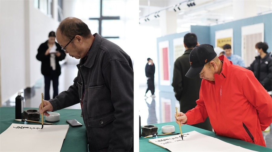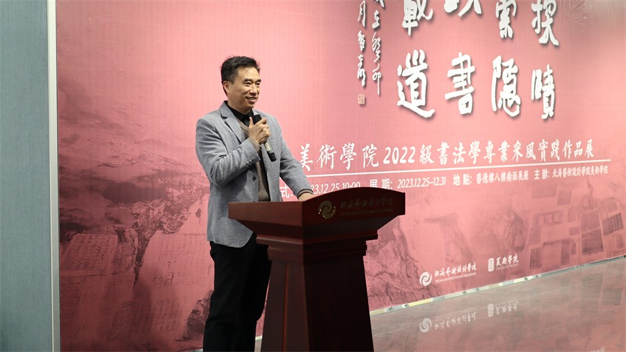 12月25日上午,“探赜索隐·以书载道”美术学院2022级书法学专业采风实践作品展于学校南校区艺德楼8楼南展厅举行开幕式。副校长陶立阳出席活动,美术学院副院长龚为,美术学院书法学专业学科带头人黎东明教授、王见教授、万应均教授、邓建华教授,美术学院书法学教研室主任苏乃从以及书法学专业任课教师参加活动。