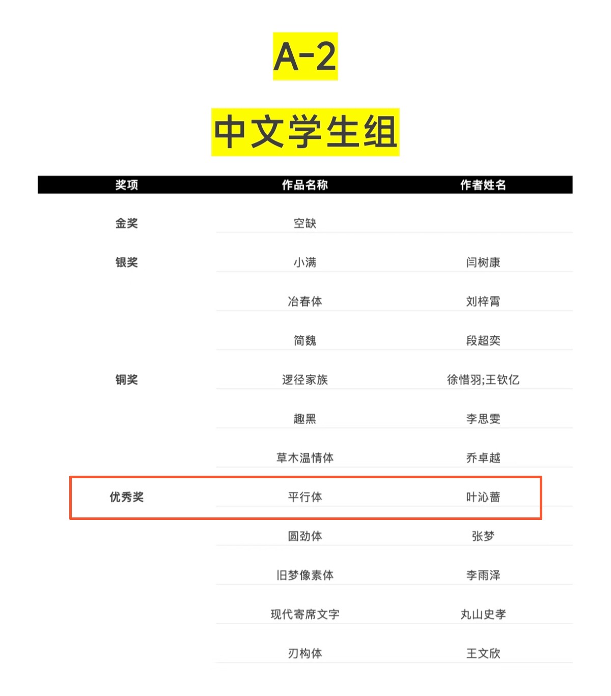 本次大赛中,我校两件字体设计课程作业表现突出。视觉传达专业2324班学生叶沁蔷作品《平行体》荣获中文学生组优秀奖最高分,同时斩获谭智恒评委奖;视觉传达专业2324班学生易思琪作品《稚碑》荣获潘虎评委奖,彰显了我校学子在字体设计领域的扎实功底与创新潜力。