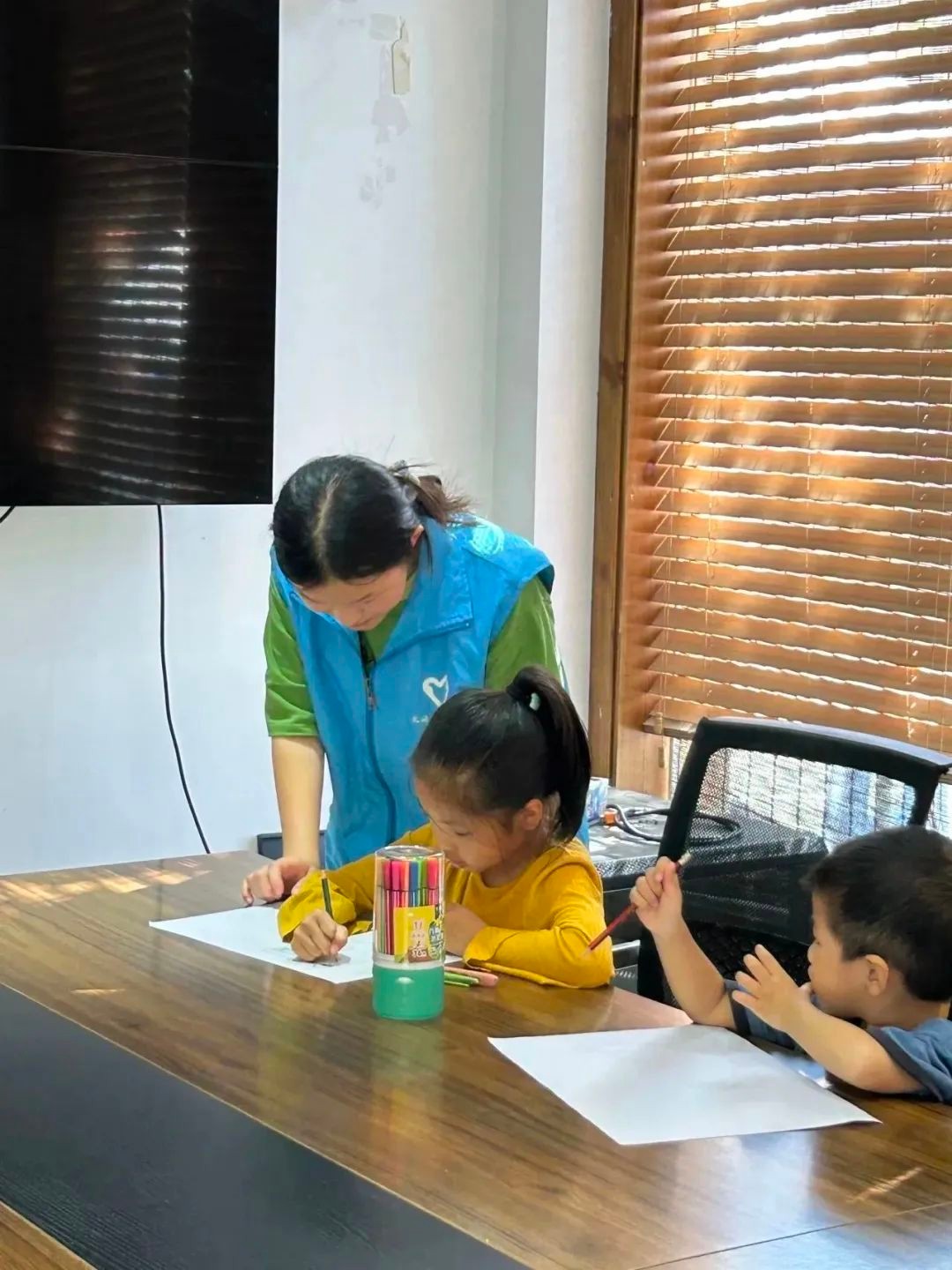 在北部湾社区,志愿者们用绘画和剪纸相结合的方式,教会孩子们做出以“杯子”为主题的作品。孩子们有的用水彩笔,有的用油画棒,他们都在用自己最喜欢的方式,用自己最熟悉的工具,一步一步创造出具有自己风格的作品。别看这小小一幅画,这可是孩子们用心的成果,他们看着自己的画作,露出了满意的笑容。