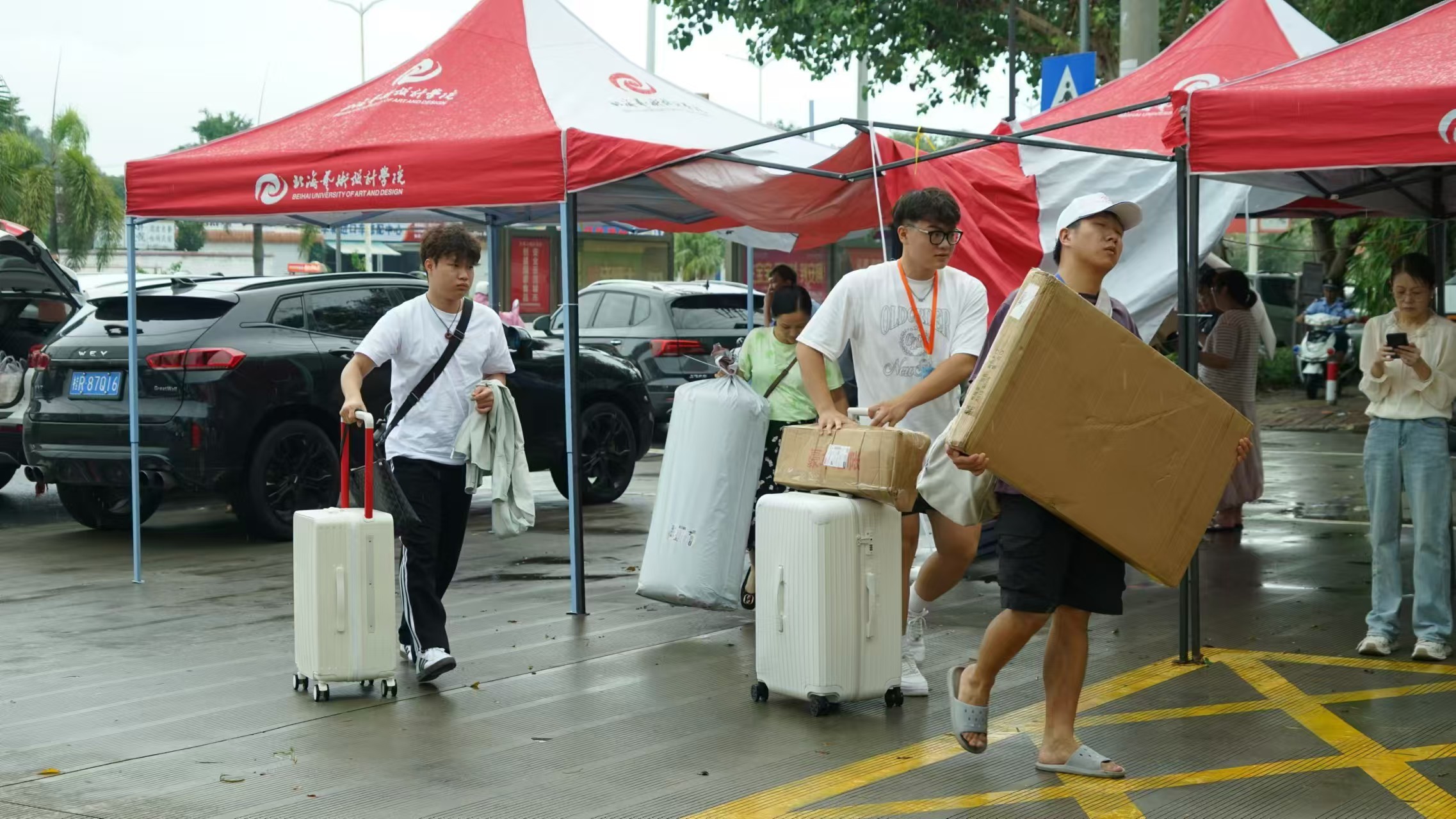 面带微笑的迎新志愿者已经忙碌起来。
