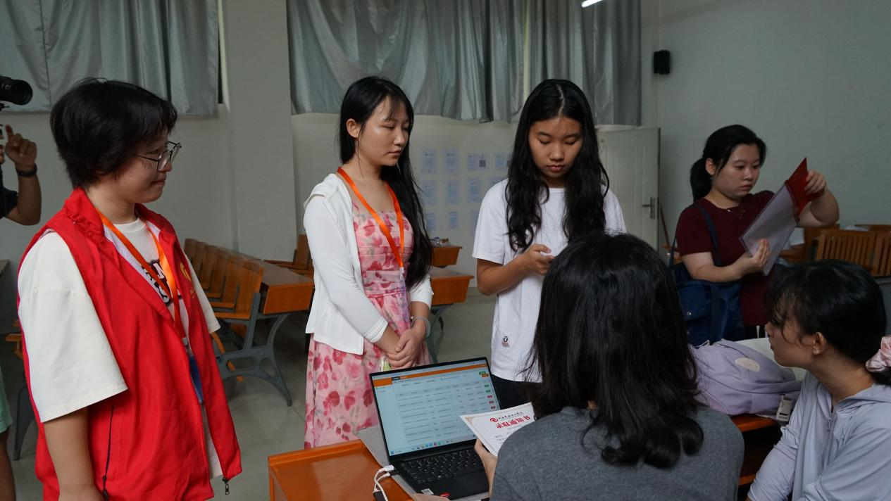 (志愿者在学校接待新生)